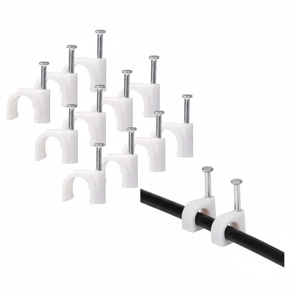 - Design: The circular “arch” of the clip is designed to wrap snugly around round cables (like coaxial, ethernet, or standard power cords) to prevent them from sliding or sagging.